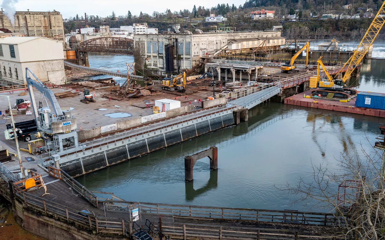 This was a renovation and improvement project for new TrashRacks and access bridge at the T.W. Sullivan Hydroelectric Plant at Willamette Falls in Oregon City, Oregon. The new trash racks will prevent debris from entering and damaging the hydropower turbines. The plant is owned and operated by Portland General Electric (PGE). Built between 1888 and 1895, it is the source of the nation's first long-distance power transmission. PGE's Sullivan Plant at Willamette Falls is one of only a few dozen hydro-plants in the country officially designated as "Green."